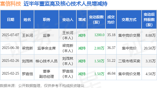 富信科技近半年内的董监高及核心技术人员增减持详情如下: